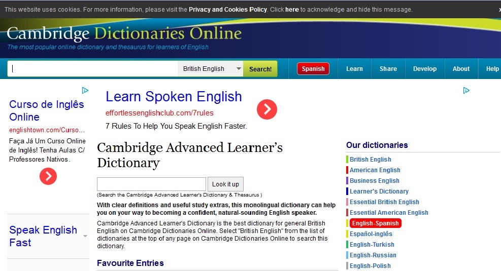 A pesquisa pode ser feita de várias maneiras: o estudante escolhe o tipo de dicionário (Inglês americano, Business,…) e digita a palavra desejada na caixa de busca, no topo da página. Depois é só clicar em “Look it up!”.