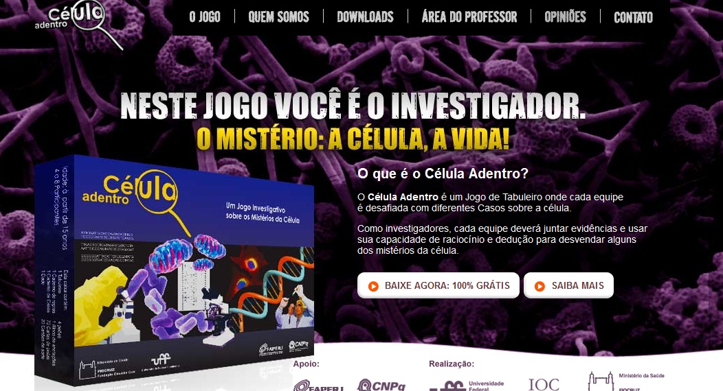 “Célula Adentro é um jogo investigativo no qual os alunos do Ensino Médio ou Superior são desafiados a resolver Casos que envolvem a Biologia Celular e Molecular, por meio da coleta, interpretação e discussão de Pistas.