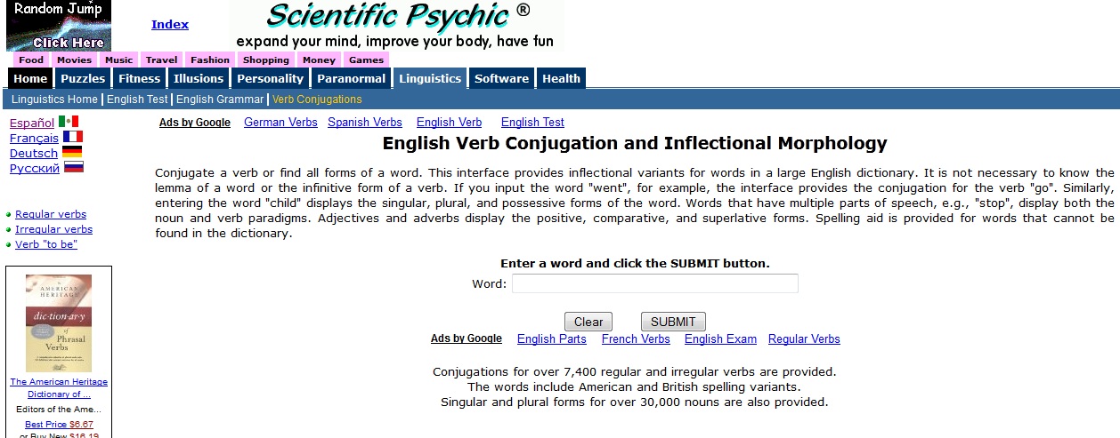 Em inglês e francês: Verb2Verbe – http://www.verb2verbe.com