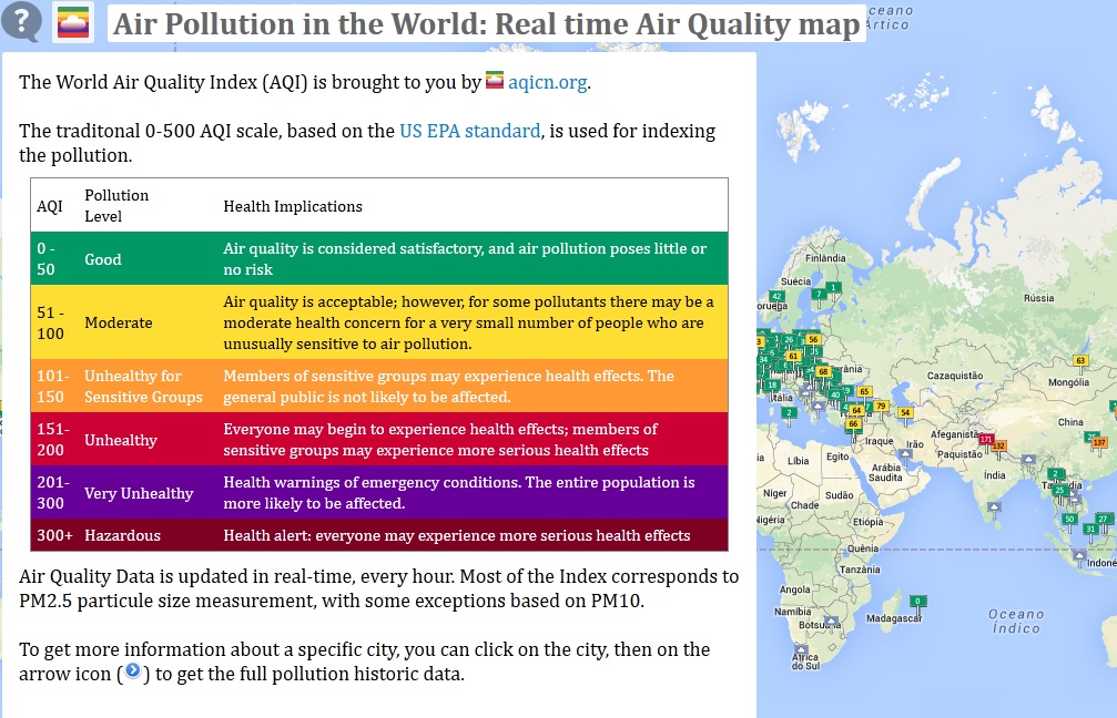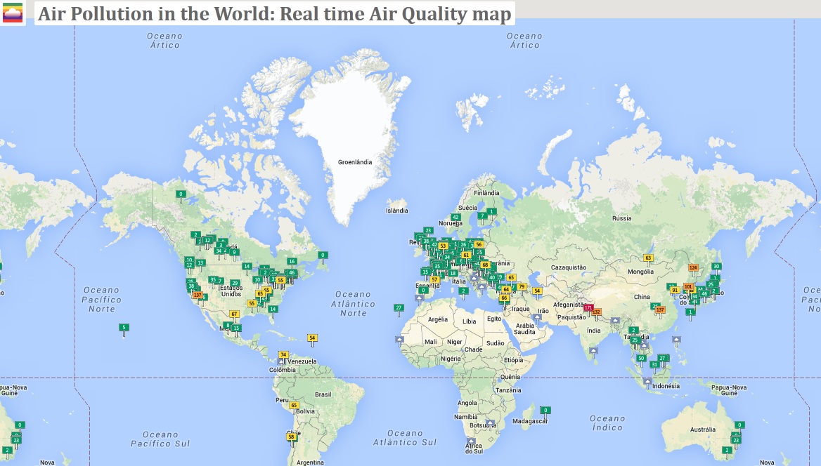 Trata-se do mapa mundial com informações sobre o nível de poluição em várias cidades do planeta.