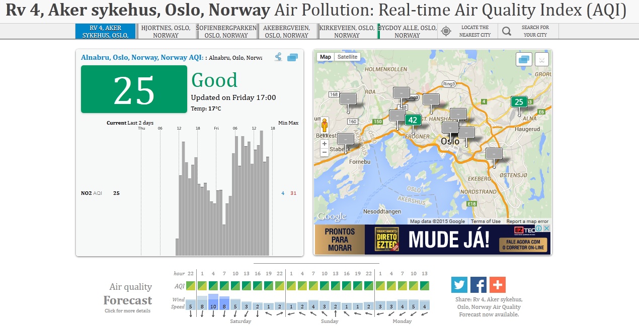 O índice da qualidade do ar (AQI) varia numa escala de 0 a 500 e é atualizado em tempo real a cada hora.